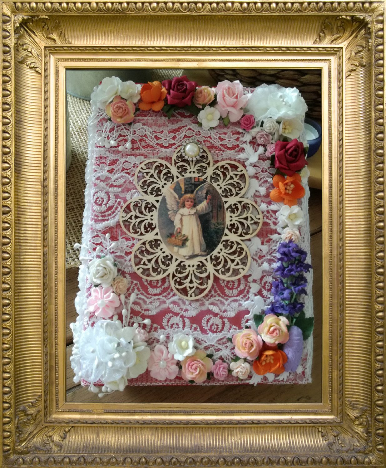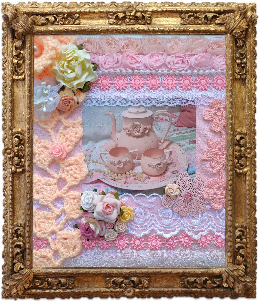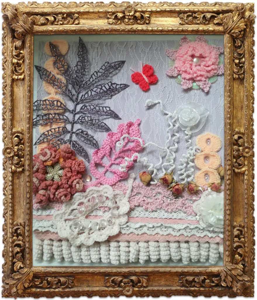 Sylvia Geist: Oder auch die Veränderung des Kontexts, die du mit deinem Mauer-Juwel durchspielst: Einmal setzt du die Handarbeit in einen Rahmen, wie man ihn eher um ein Rubensgemälde zu sehen gewöhnt ist, und in einem weiteren Arbeitsschritt – du hast dich eines Programms namens Fotofunia bedient – in ein fiktives Museum mitsamt Besuchern und Betrachtern. Das führt zu der Frage, welche Rolle der „Rahmen“, also die Präsentation und deren Implikationen, für die Rezeption eines Werks spielen. Die Tatsache, dass ich diese Frage, diese Brechung in deinen „Mauer-Juwel“-Arbeiten entdecke, macht es mir schwer, sie überhaupt als Kitsch wahrzunehmen, denn der kommt ja ohne solche Brechung aus.